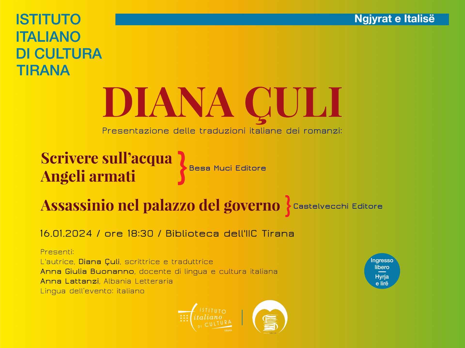 Diana Çuli è una delle autrici più prolifiche e rappresentative del panorama letterario albanese. Scrittrice e traduttrice pluripremiata in Albania e all’estero, è nota in Italia, sia per la sua penna, che per il grande impegno come attivista per il riconoscimento dei diritti delle donne. Analizzando i libri tradotti in italiano, si ripercorreranno i diversi periodi storici dell’Albania, che hanno segnato l’evoluzione collettiva del popolo e quella dell’individuo, si entrerà nel mondo delle donne e ci si confronterà sul variegato universo balcanico. Diana Çuli nasce a Tirana nel 1951. Si laurea in Lingua e letteratura albanese ed è ancora giovanissima quando collabora con la rivista Drita, per poi inserirsi nella redazione Les lettres albanaises, che vede a capo il celebre Kadare. Diana è autrice, in Albania, di libri di successo, come Zëri i largët (La voce lontana, 1981), Rrethi i kujtesës (Il circolo della memoria, 1984), Dreri i trotuarëve (Il cervo dei marciapiedi, 1990) e Requiem (1991). Sono tre i volumi tradotti in italiano: Scrivere sull’acqua, (Besa Muci Editore), Angeli armati, (Besa Muci Editore), Assassinio nel Palazzo del governo, (Castelvecchi Editore). Una penna multiforme la sua, che dona gli albori a componimenti di svariati generi, spaziando dal mondo dei racconti a quello dei gialli, per poi arrivare all’universo teatrale, che trae interessanti sceneggiature da alcune sue opere.