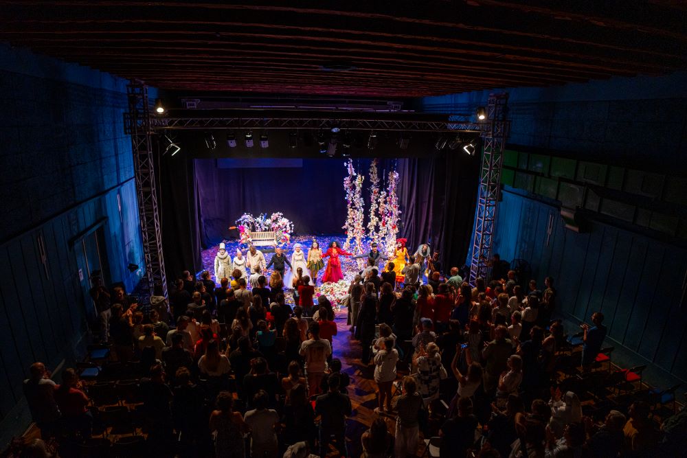 Ogni spettacolo può essere un viaggio, un attraversamento di situazioni, stati d’animo, intuizioni diverse, che ti colgono di sorpresa. La recita di ogni sera non è più recita, ma è un rito, è un apparire e un gesto unico che lega chi agisce a chi guarda, in un comune respiro. Fare uno spettacolo sulla gioia vuol dire cercare quella circostanza unica, vuol dire attraversare i sentimenti più estremi, angoscia, felicità, dolore, entusiasmo, per provare a scovare, infine, in un istante, l’esplodere di questa gioia. Invece di fissarsi in delle immagini, dei suoni, dei movimenti sul palcoscenico, Pippo Delbono e gli attori della sua compagnia cercano di compiere ogni giorno un passo in più verso questa esaltazione assoluta, questa bruciante intuizione. Ecco allora il circo, coi suoi clown e i suoi balli. Ecco pure il ricordo di uno sciamano che con la follia libera le anime. Ecco quindi malinconie di tango e grida soffocate in mezzo al pubblico. Ecco una pienezza di visioni, che si susseguono, si formano, si confondono e si perdono una via l’altra, centinaia di barchette di carta, sacchi di panni colorati a comporre, sembra, quel «mare nostro che non sei nel cielo» della laica preghiera di Erri De Luca, fino all’esplosione floreale, creata da Pippo assieme a Thierry Boutemy, il fleuriste normanno di stanza a Bruxelles e abituato a lavorare in lungo e in largo per il mondo.