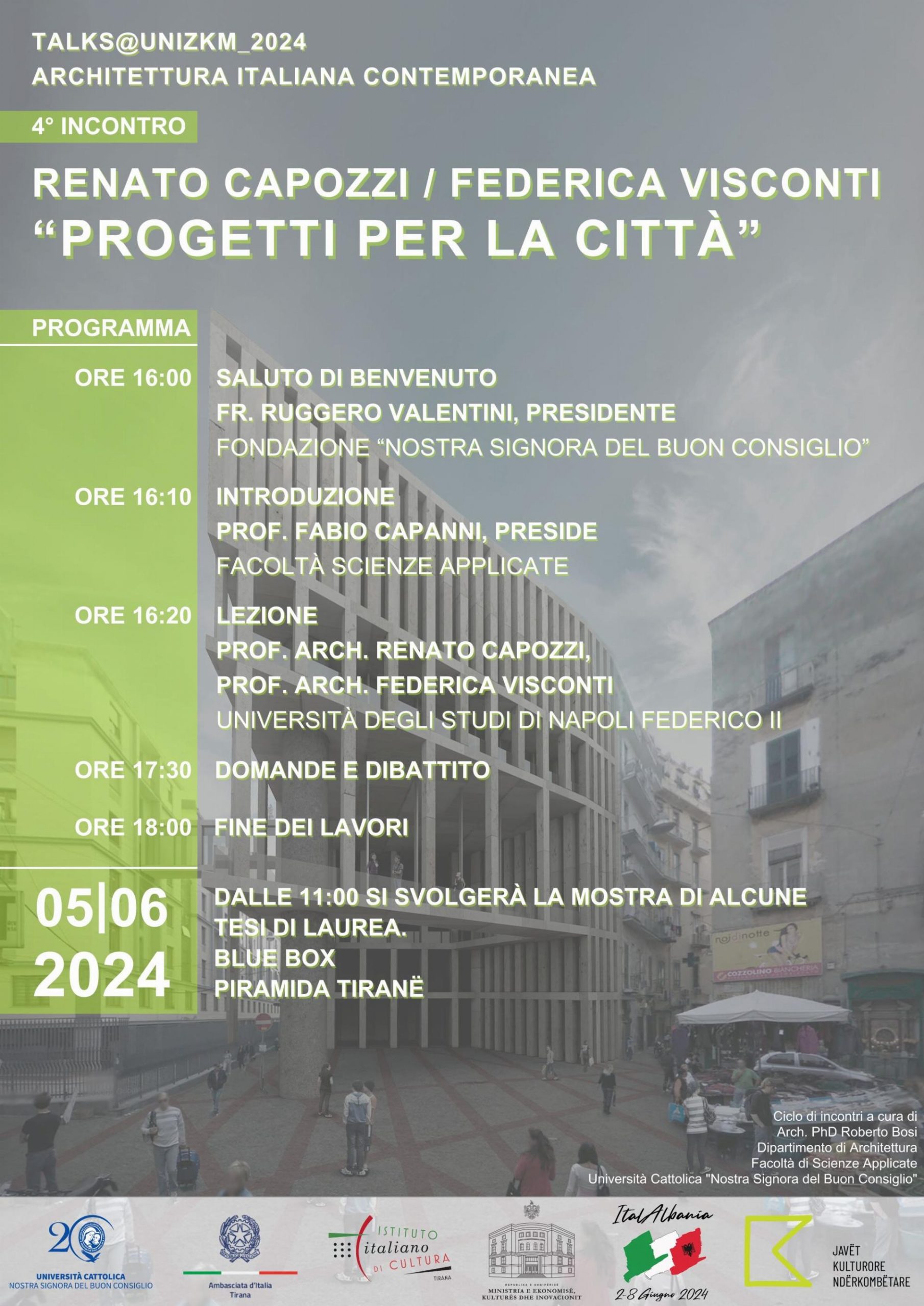 L’Istituto Italiano di Cultura in collaborazione con l’Ambasciata d’Italia a Tirana e l’Università Nostra Signora di Buon Consiglio è lieto di presentare il IV incontro del ciclo di conferenze TALKS@UNIZKM_2024 ARCHITETTURA ITALIANA CONTEMPORANEA:  Renato Capozzi – “Progetti per la città”