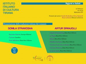 Instituti Italian i Kulturës në bashkëpunim me Albania Letteraria, ka kënaqësinë të organizojë takimin me shkrimtarët Artur Spanjolli dhe Sonila Strakosha, të cilët do të prezantojnë librat në italisht. Artur Spanjolli I nipoti di Scanderbeg La Teqia Eduart Preludio d’autunno Cronaca di una vita in silenzio L’accusa silenziosa La sposa rapita nga Besa Muci Editore […]