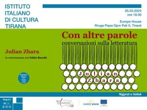 Instituti Italian i Kulturës, në bashkëpunim me Europe House Albania, në kuadër të ciklit Me fjalë të tjera, një sërë takimesh dhe bisedash me zërat më interesantë të narrativës italiane me origjinë shqiptare, ka kënaqësinë të prezantojë takimin me shkrimtarin Julian Zhara. Shkrimtari do të bashkëbisedojë me Fabio M. Rocchi, profesor universitar në Departamentin e […]