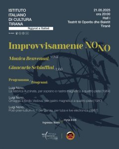 Instituti Italian i Kulturës në bashkëpunim me TEMPO REALE – Qendër kërkimi, produksioni dhe edukimi muzikor dhe Teatrin e Operas dhe Baletit, Tiranë ka kënaqësinë të prezantojë koncertin kushtuar Luigi Nono-s “IMPROVVISAMENTE NONO” Monica Benvenuti, Giancarlo Schiaffini, Francesco Vogli, Improvvisamente, improvizim për vokal, tubë dhe live elektronics (2024) Monica Benvenuti, vokal Giancarlo Schiaffini, tubë Tempo […]